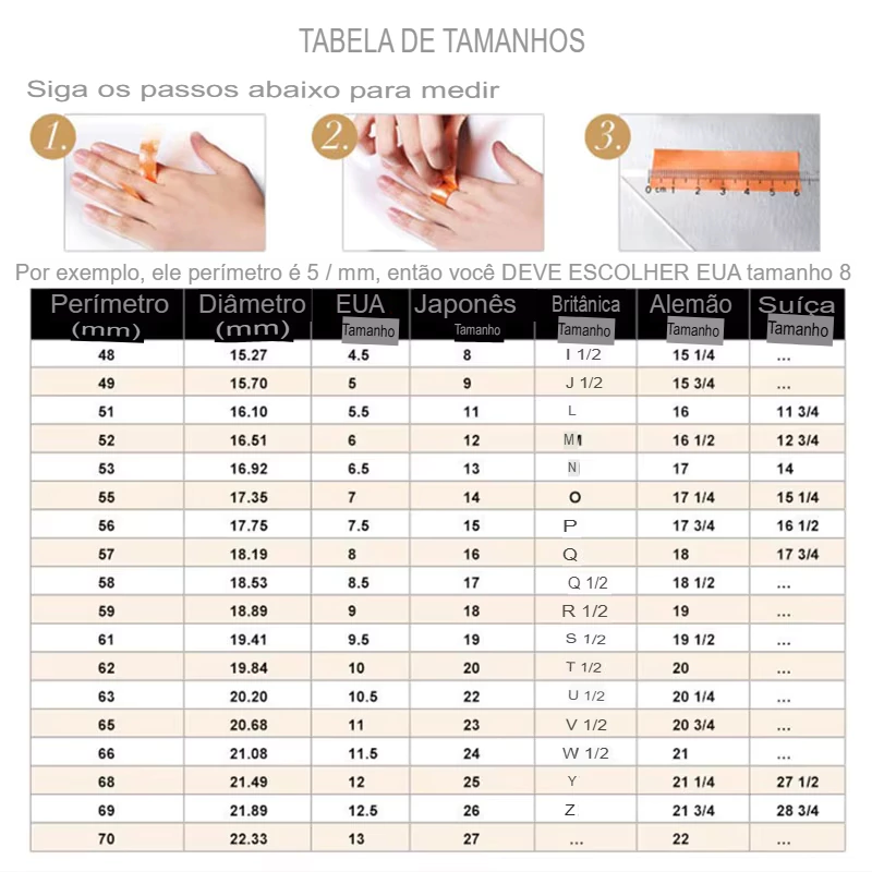 Tamanho do Anel: BRASIL 12/17/19/22/25/28/31/34